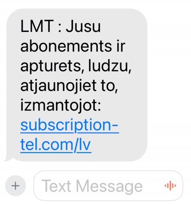 Vairāki klienti saņēmuši ziņu ar šādu tekstu: “LMT : Jusu abonements ir apturets, ludzu, atjaunojiet to, izmantojot: saite”.